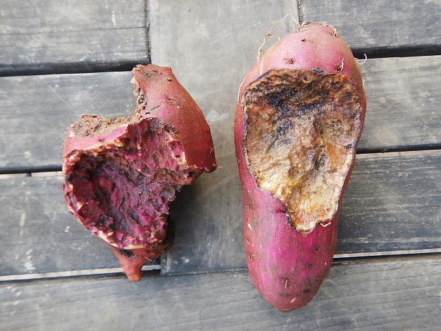 ハツカネズミ 収穫時に見られた食害(古い食害箇所は紫に変色)