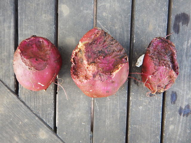 ハツカネズミ 収穫時に見られた食害(古い食害箇所は紫に変色)