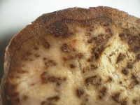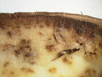 被害:イモの皮が茶色に変色し、内部が黒変する。軟腐病を併発するとアルコール臭くなる。