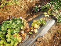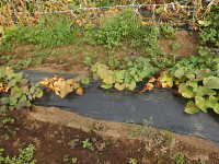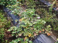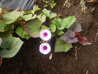 | サツマイモは干害には比較的強い野菜であるが、初期生育が悪い株では葉が黄化し、一部は枯死することがある。 また、干害時には花が咲きやすい。これは栄養生長ができない環境になると、生殖生長に移行するためである。 |