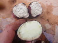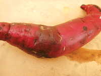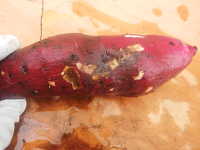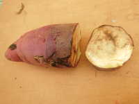 | 発生時期:9月〜10月 病原:糸状菌(リゾプス属菌) ※他の軟腐病の病原は、細菌 伝染方法:病原は土壌中に広く分布し、傷口から侵入する。 被害:イモ内部が薄褐色に変色して軟化し、アルコール臭い。イモを掘り上げ後、1週間で症状が現れる。 |