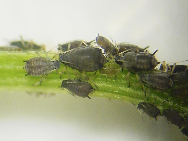 葉柄のワタアブラムシのコロニー