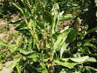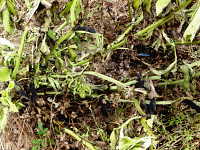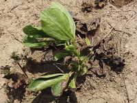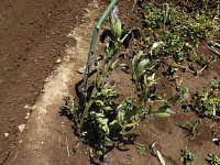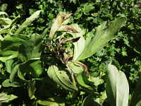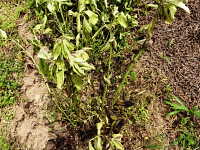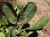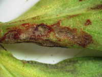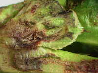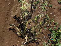 被害:葉や茎に赤褐色の壊疽を生じ、発病株は草丈が低くなる。症状が重いと枯死する。