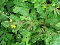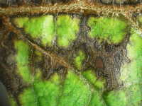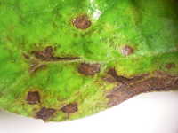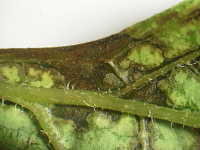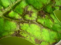 被害:褐色病斑が葉脈に沿って拡大し、進展すると葉全体が褐変する。