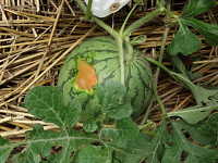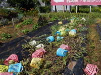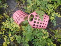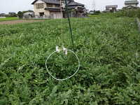 | ハシボソガラスは、スイカを好んで食害する。なお、果皮が縞模様のスイカが狙われ、果皮の黒いスイカは被害を受けないことが多い。 私が勤務する大学農園では、小玉スイカの果実が肥大し始めるとカラス被害に逢うため、100円ショップで購入した防鳥カゴに果実を入れるようにしたところ、それからは被害が全くなくなった。 |