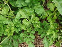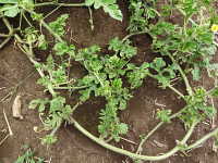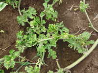 被害:葉が濃淡モザイクとなって縮れる。果実は縞が不鮮明になる。
