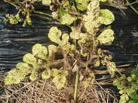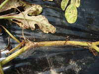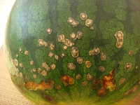 | 発生時期:7月〜8月 病原:糸状菌(かび) 伝染方法:発病葉上の病原菌がほ場に残り、伝染源となる。土はね伝染する。 被害:葉、茎、果実に褐色の病斑を作る。湿度が高い時は、病斑上に鮭肉色の胞子を形成する。 |