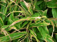 被害;葉に褐色の斑点を生じ、周縁部に広がり、進展すると葉全体が枯死する。病斑上には黒色小粒点を散生する。