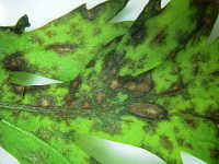 被害:葉に褐色の楕円形病斑ができ、病斑内に黒色小粒点を生じる。激発時は、楕円形病斑の周囲が水浸状となり、下葉から急速に進展する。