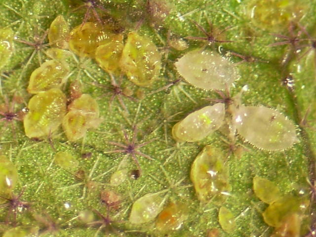 タバココナジラミとオンシツコナジラミの蛹・幼虫が混在したナス葉