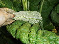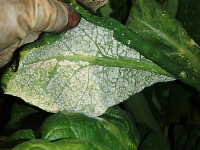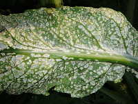 | 発生時期:4月〜5月 病原:糸状菌(かび) 伝染方法:ほ場に残った発病茎葉上の病原菌が、次期作の伝染源となる。 被害:葉表は不鮮明な黄色病斑、葉裏は白く盛り上がった病斑を生じる。 |