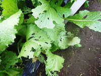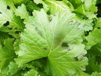 被害:葉に灰色の円形病斑を生じ、次第に穴が広がる。