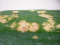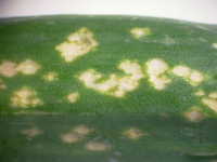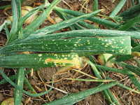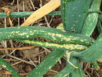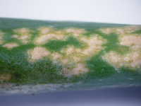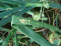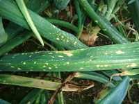 | 発生時期:5月〜6月 病原:糸状菌(かび) 伝染方法:病原菌(ボトリチス菌)は、ほ場に常時生存し、下葉や葉先が枯れると、そこに侵入する。 被害:葉身に灰白色の斑点を多数生じる。 |