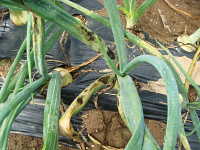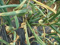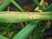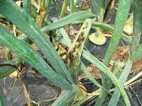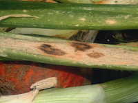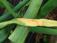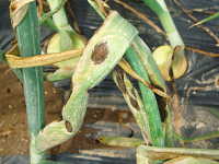 被害:葉に褐色〜黒色の楕円形病斑を生じ、病勢が進むと葉が枯死する。