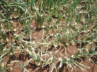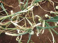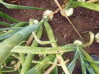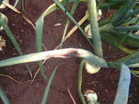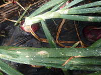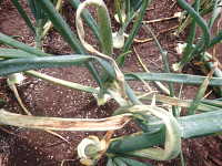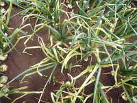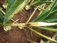 | 発生時期:5月 病原:糸状菌(かび) 伝染方法:ほ場に残った発病葉上の病原菌が伝染源となる。 被害:葉に初期は白色小斑点を生じ、次第に褐色の楕円形病斑に進展し、病勢が進むと葉が黄化枯死する。 |