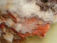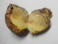 | 発生時期:5月〜8月 病原:糸状菌(かび) 伝染方法:土壌中に残った病原菌が伝染源となる。 被害:りん茎の茎盤に白かびを生じ、内部が水浸状に腐敗する。 |
