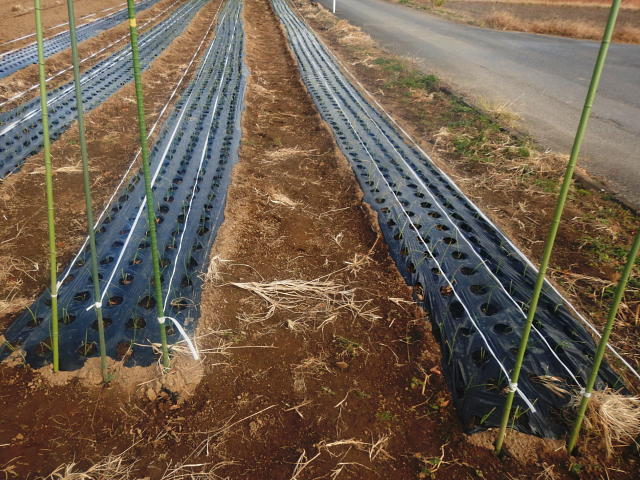 マルチ上に白いマイカ線を3本張る