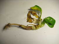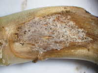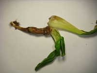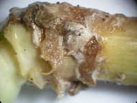 | 発生時期:1月(ハウス内) 病原:糸状菌(かび) 伝染方法:地表面に落ちた菌核が伝染源となる。 被害:地際部に白いかびが発生し、後にネズミ糞状の菌核を生じる。 |