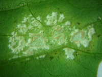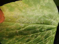 被害:葉表は不鮮明な黄色病斑、葉裏には白く盛り上がった病斑を生じる。