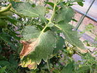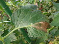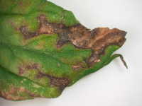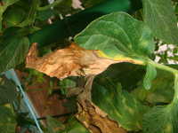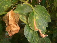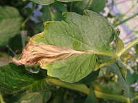 伝染方法:ほ場に残った発病葉・発病果上の病原菌や、地表面に菌核として残った病原菌が、伝染源となる。次期作では、そこから胞子が飛散して伝染する。