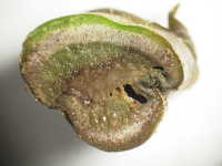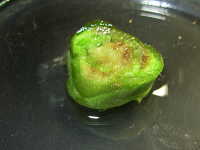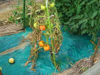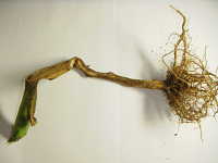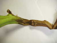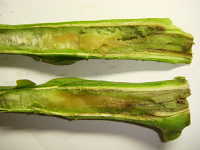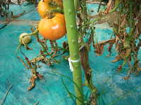 | 発生時期:7月 病原:細菌 伝染方法:種子伝染する。また、細菌が被害植物の組織内で越冬し、土壌伝染する。 被害:茎の導管が侵され、葉の萎れや褐変が生じる。果実には鳥目状病斑を生じる。 |