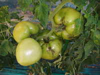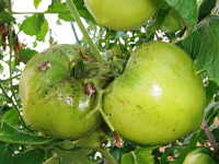 被害:葉と果実に褐色輪紋状斑点を生じる。果実では黒色小斑点が次第に大きくなり、中心部が白色となる。
