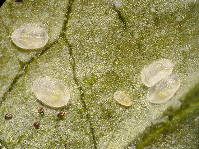 オンシツコナジラミ2齢幼虫(体長0.4mm)及び4齢幼虫(体長0.8mm)