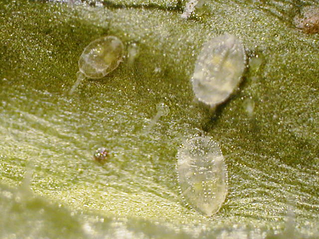 オンシツコナジラミ3齢幼虫(体長0.5mm)及び4齢幼虫(体長0.8mm)