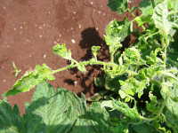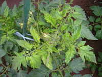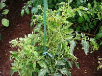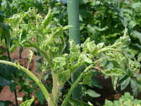 | 発生時期:トマトの生育期間中 病原:ウイルス(トマト黄化葉巻ウイルス:TYLCV) 伝染方法:タバココナジラミがウイルスを媒介する。(虫は死ぬまで伝搬する:永続伝搬) 被害:新しく展開する葉が縁から葉を巻き、葉脈間が黄化して縮葉する。上位葉が黄化縮葉し、節間が短縮して株全体が萎縮する。発病前に着果した果実は正常に発育するが、発病後は開花せず、開花しても結実しない。 |