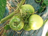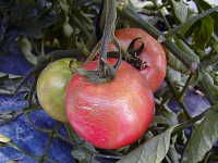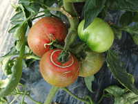 | 発生時期:4月〜6月 発生原因:乾燥が続いた後の灌水により、果実が急激に肥大。 被害:果皮に同心円状又は放射状のひびが入り、商品価値がなくなる。 |