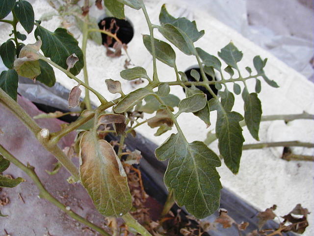 トマトサビダニ 葉の周辺部が黄褐色になり、そり返る