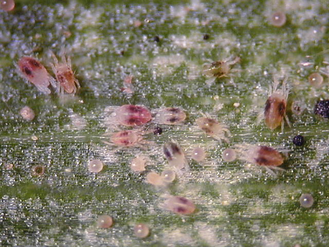 カンザワハダニ第2若虫(体長0.35mm)、第1若虫(体長0.2mm)及び卵(直径0.15mm)