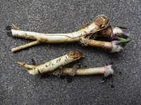 | ワサビダイコンは5月に3cm程度に切った根を植え付け、11月に太い根を収穫する。 |