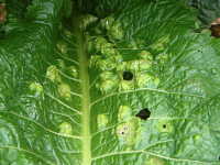 被害:葉表は不鮮明な黄色病斑、葉裏は白く盛り上がった病斑を生じる。