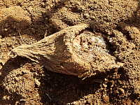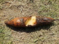 | 発生時期:4月 病原:糸状菌(リゾプス属菌) ※他の軟腐病の病原は、細菌 伝染方法:病原は土壌中に広く分布し、傷口から侵入する。 被害:イモ内部が褐色に変色して軟化し、アルコール臭い。いもの表面に白色菌糸を密生し、黒い胞子のうが現れる。 |
