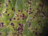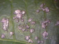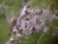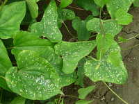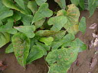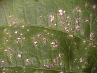 | 発生時期:7月〜8月 病原:糸状菌(かび) 伝染方法:病原菌は被害残さとともに越冬し、翌年の伝染源となる。 被害:葉、葉柄、茎に白色の病斑を生じる。 |