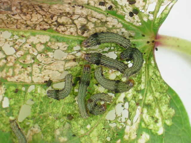 ハスモンヨトウ中齢幼虫のコロニー