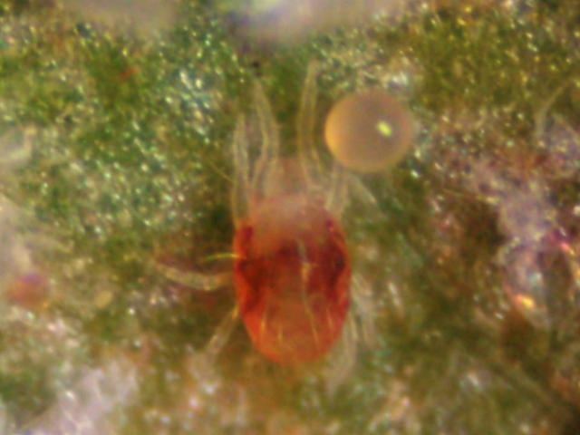 カンザワハダニ第1若虫(体長0.2mm)及び卵(直径1mm)