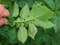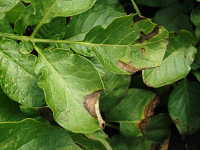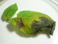 | 発生時期:6月〜7月 病原:糸状菌(かび) 伝染方法:病原菌は、塊茎内に菌糸で生存し、発芽した芽が侵されて伝染する・ 被害:葉、葉柄、茎のほか塊茎にも発病する。 |