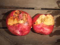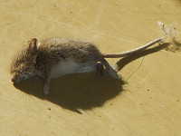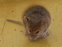 | ハツカネズミは雑食性で、種子や穀物類、小型の昆虫類を食べる。 これは、11月のジャガイモの収穫時に見つけた食害イモで、収穫中にハツカネズミが逃げ出す姿も確認された。 |
