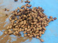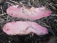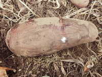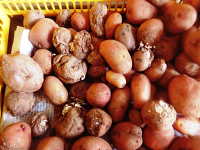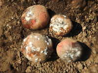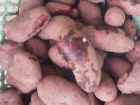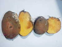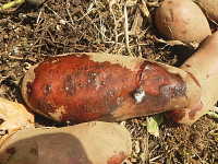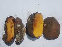 被害:イモの内部が褐変し、水分が外に出て、スポンジ状となる。 白いカビが発生。