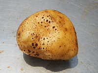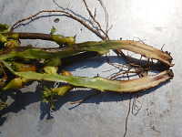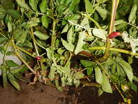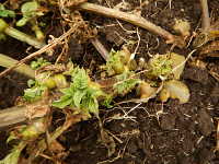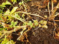 被害:病原菌が茎に侵入し、地上部への水分供給とイモへの同化養分の転流ができにくくなることにより、気中塊茎が生じ、変形イモが増加する。