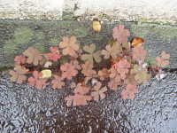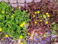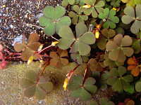 | 多年草 茎の長さ:5〜20cm 花期:4月〜5月 生育場所:道ばた、庭など 特徴:心臓型の小葉が3枚集まって複葉となり、葉色は赤紫色。黄色い花が目立つが、日が照らないと開かない 名前の由来:葉が赤紫色なので「アカ」。夕方になると葉を閉じるため、葉が一方だけ欠けたように見えるので「 参考:カタバミの一品種であり、舗装道路の隙間など、乾燥して温度が高い場所に生えることが多い。 |
