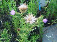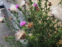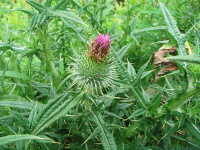 | 越年草 草丈:50cm〜100cm 花期:6月 生育場所:空き地、荒れ地など 特徴:葉や茎の鋭いトゲと赤紫色の大きな花。 名前の由来:ヨーロッパ原産であるが、北アメリカから渡来したため「アメリカ」。鋭く長いトゲが生えているので「オニ」。葉がチクチク痛いことを「あざむ」と言い、これが変化して「アザミ」。 |