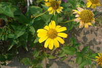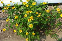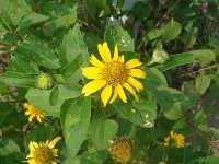 特徴:大型の黄色い花で舌状花は13枚前後。葉は長楕円形で硬い毛がありザラザラする。