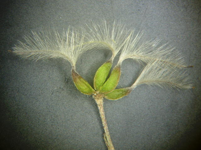 ボタンヅル 果実(長さ3.5mm)と白く羽毛状の花柱(長さ7mm)