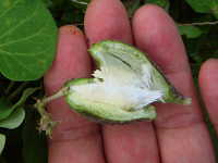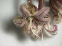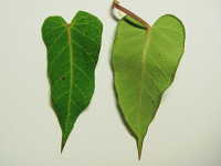 特徴:葉は細長いハート型で葉柄がある。花は薄紫色で、イモ型の果実を付ける。つるで他の植物等にからみついて伸びる。