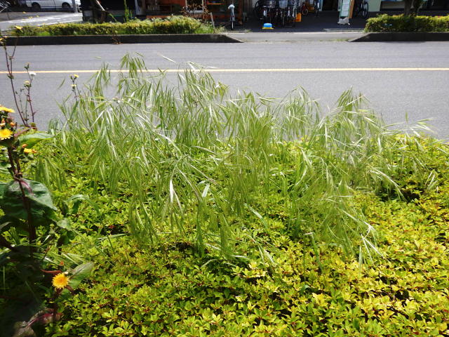 ヒゲナガスズメノチャヒキ ツツジの植栽の上に花序が飛び出す