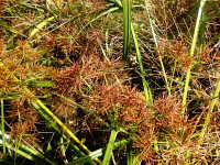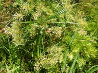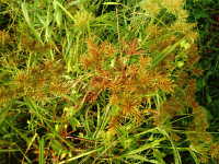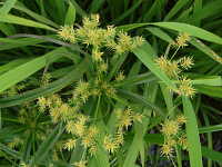 | 1年草 草丈:50cm〜70cm 花期:7月〜9月 生育場所:水田の畦など 特徴及び名前の由来:実(小穂)が細く黄金色のカヤツリグサ。 |