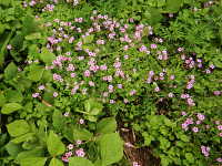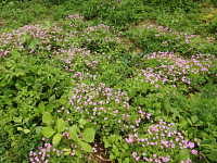 特徴:桃色のきれいな小花が多数咲き、ムラサキカタバミによく似るが、雄しべの葯は黄色(ムラサキカタバミは白色)で、花の中心部が赤い。